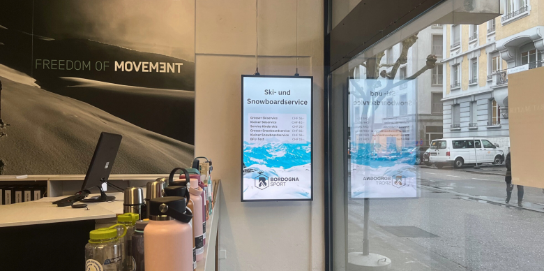 Bei Gotschna Sport in Klosters ist ein Doppelscreen im Hochformat ausserhalb des Geschäfts und ein Screen im Querformat bei der Vermietungsstation im Geschäft buchbar.